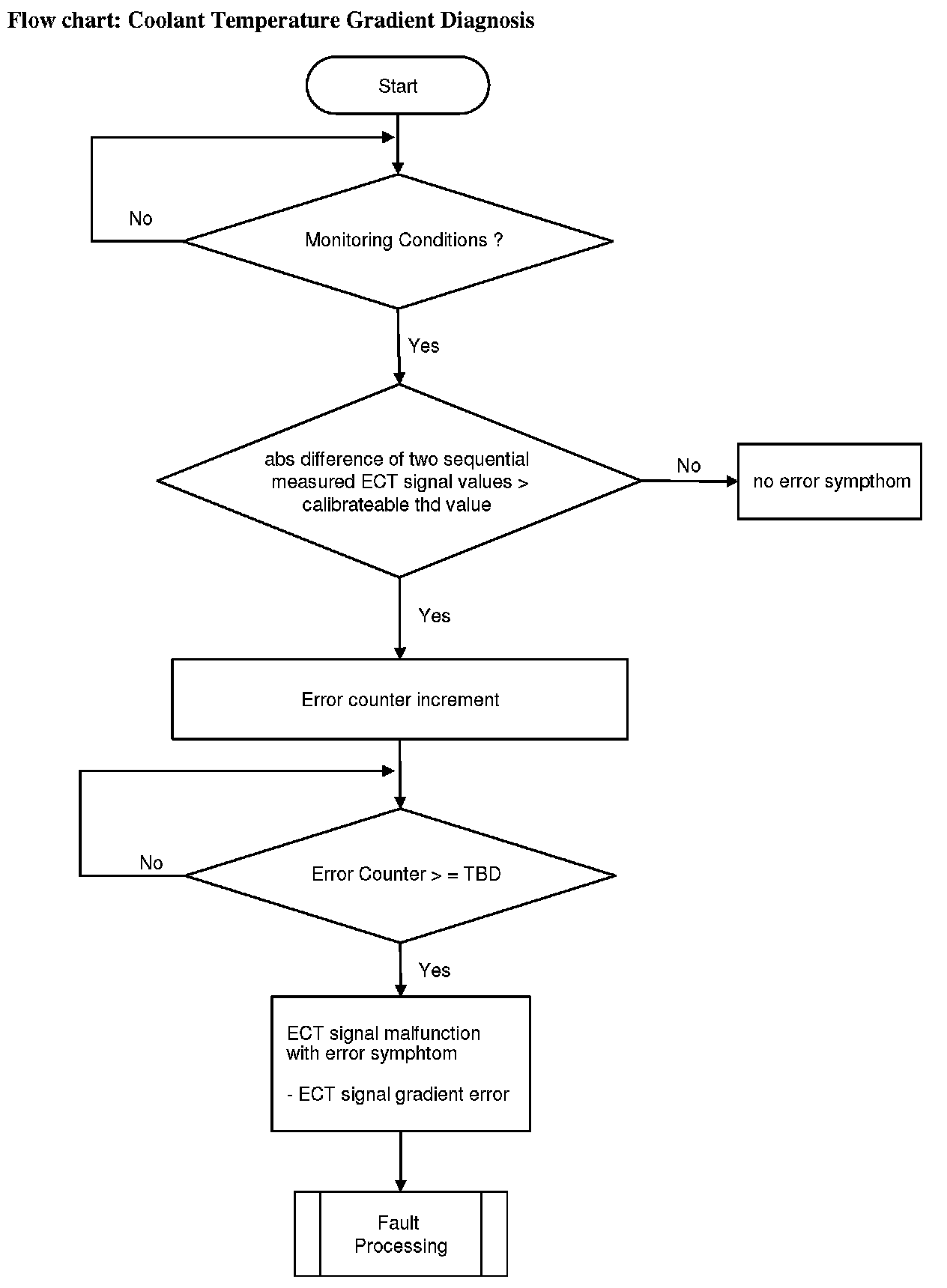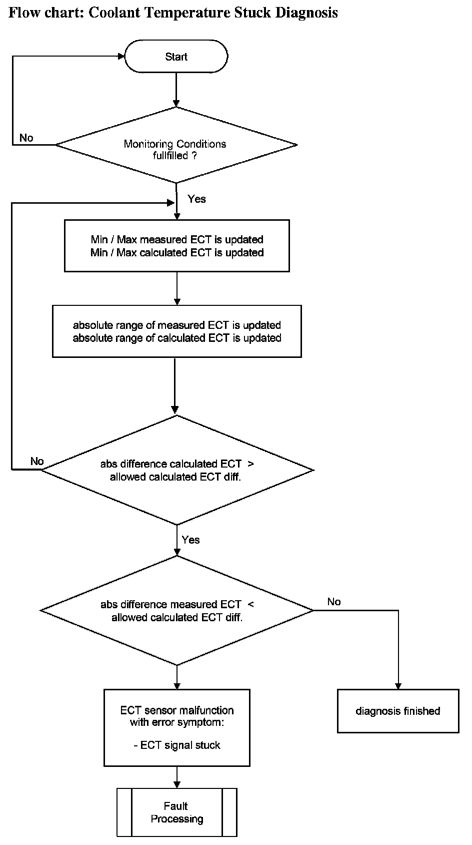 This coolant temperature plausibility diagnosis is performed once per engine run. At low ambient temperature a stuck open thermostat can cause an insufficient engine warm up. In the case that the coolant temperature is lower than the start temperature for coolant thermostat diagnosis a coolant temperature plausibility error will be detected.