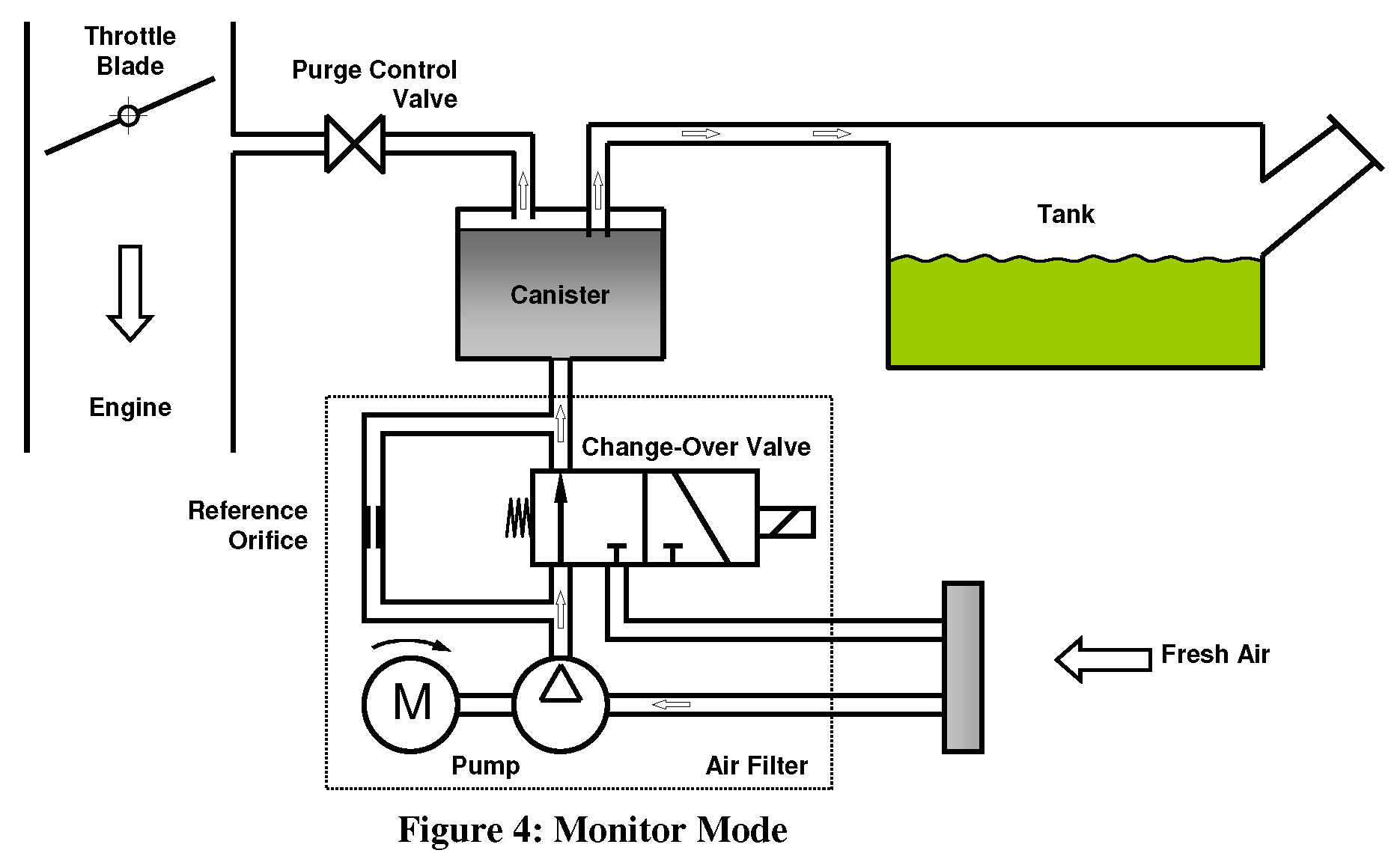 In the Monitoring Mode (Fig. 4) the change-over valve is switched on while the purge control valve remains closed. The motor current drops to a zero-load level. Fresh air is now pumped through the charcoal canister into the tank. A small overpressure, indicated by an increase in the motor current, builds up if the evaporative system is tight.