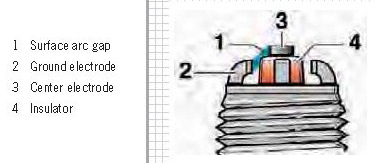 The four ground electrodes are arranged around the ceramic insulator in the surface-gap spark plugs. The sparks (1) cross the surface of the insulator (4) and arc across a small gas gap to the ground electrode (2), which improves the ignition properties. The main advantage of the surface-gap spark plugs is the self-cleaning effect of the insulator foot tip, since any shunts that occur between the center electrode and the ground electrode through the surface gaps, in particular during a cold start, are eliminated.
