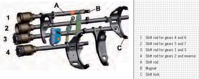 Each shift rod has a sensor magnet for recording shift travel via the transmission distance sensors.