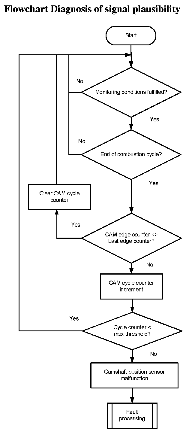 The monitor checks once per combustion cycle the edge counter of the camshaft. If the edge counter has not changed during the last cycle, a cycle counter is incremented. When the counter reaches a threshold, the error CAM_plaus is delivered to the error management.