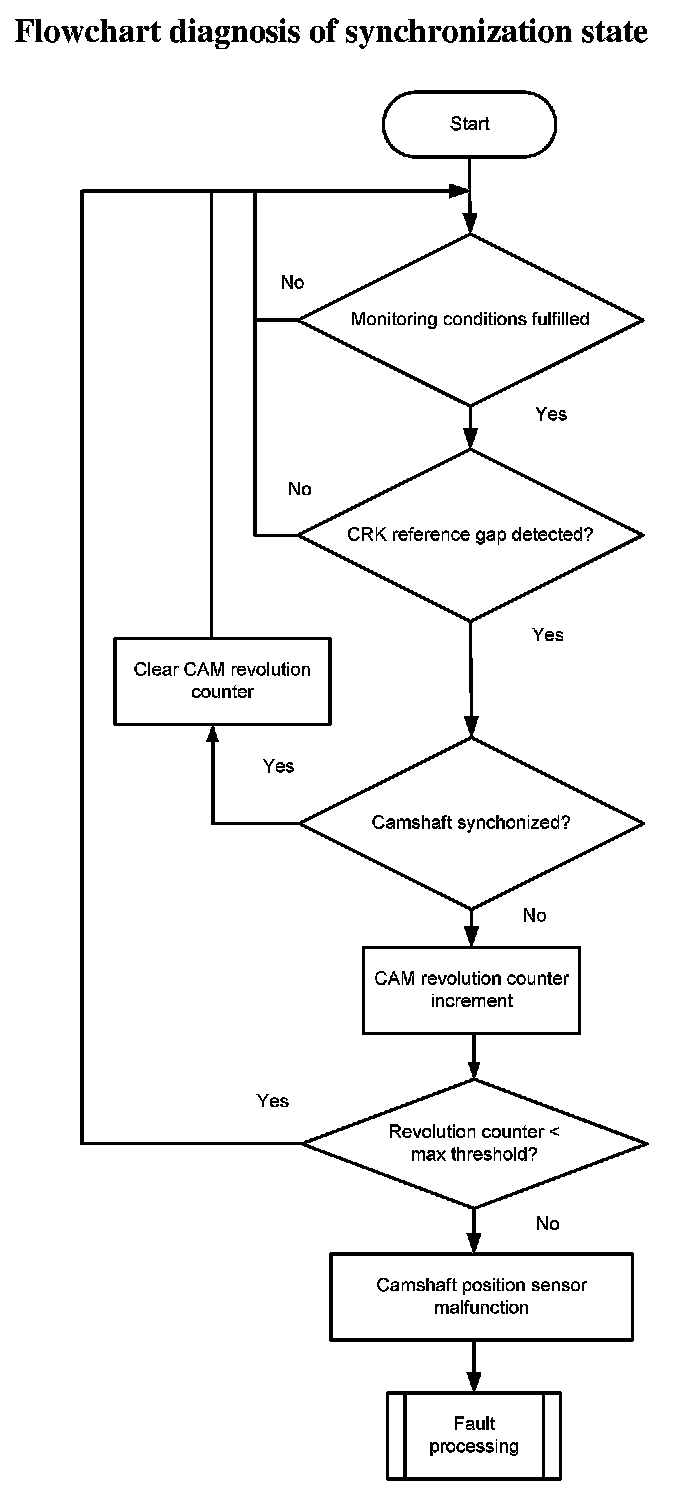 The monitor checks at every reference gap of the crankshaft sensor signal whether the camshaft is synchronized or not. If the camshaft is not synchronized, a revolution counter for the camshaft is incremented. When the counter reaches a threshold the error CAM sync is delivered to the error management.