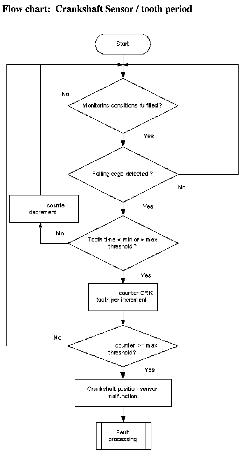A teeth counter is incremented at every falling edge of the CRK sensor signal. If plus or minus one tooth is detected Flowchart diagnosis of mechanical reference position and diagnosis of chain jump. 360 °CA at the reference gap, the tooth number counter will be incremented. If the counter exceeds a limit, a CRK tooth error is delivered to the error management.