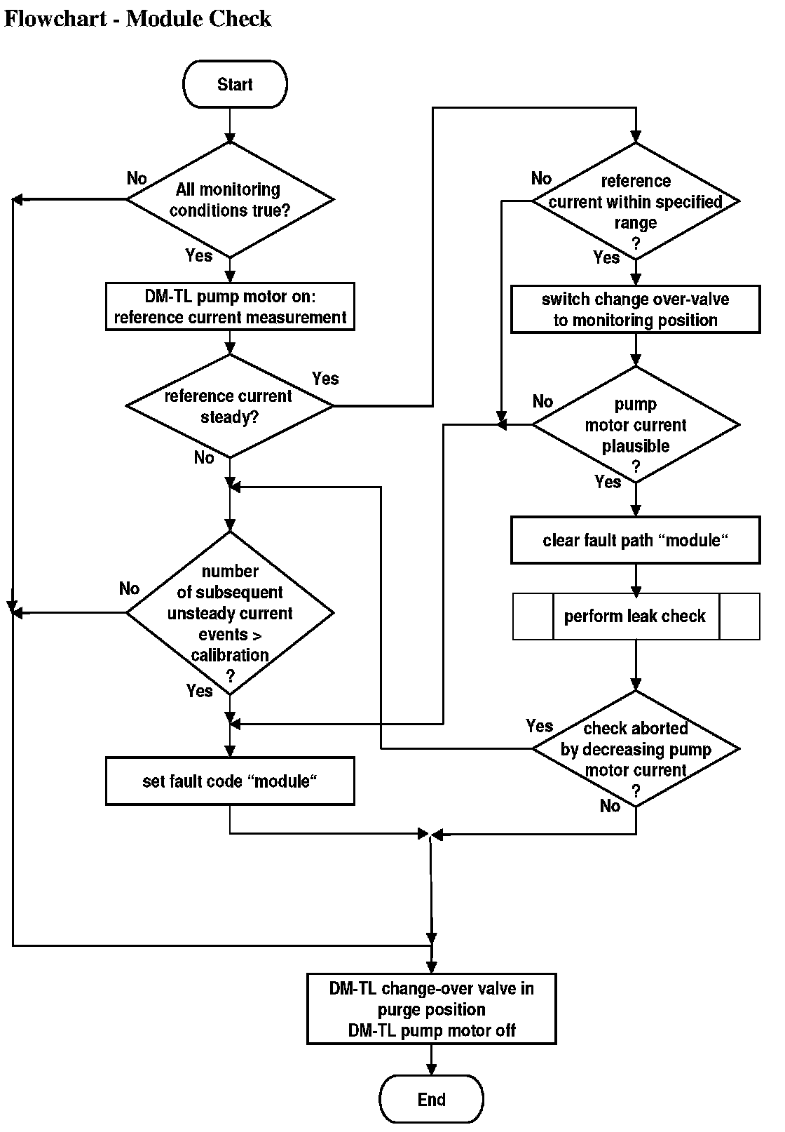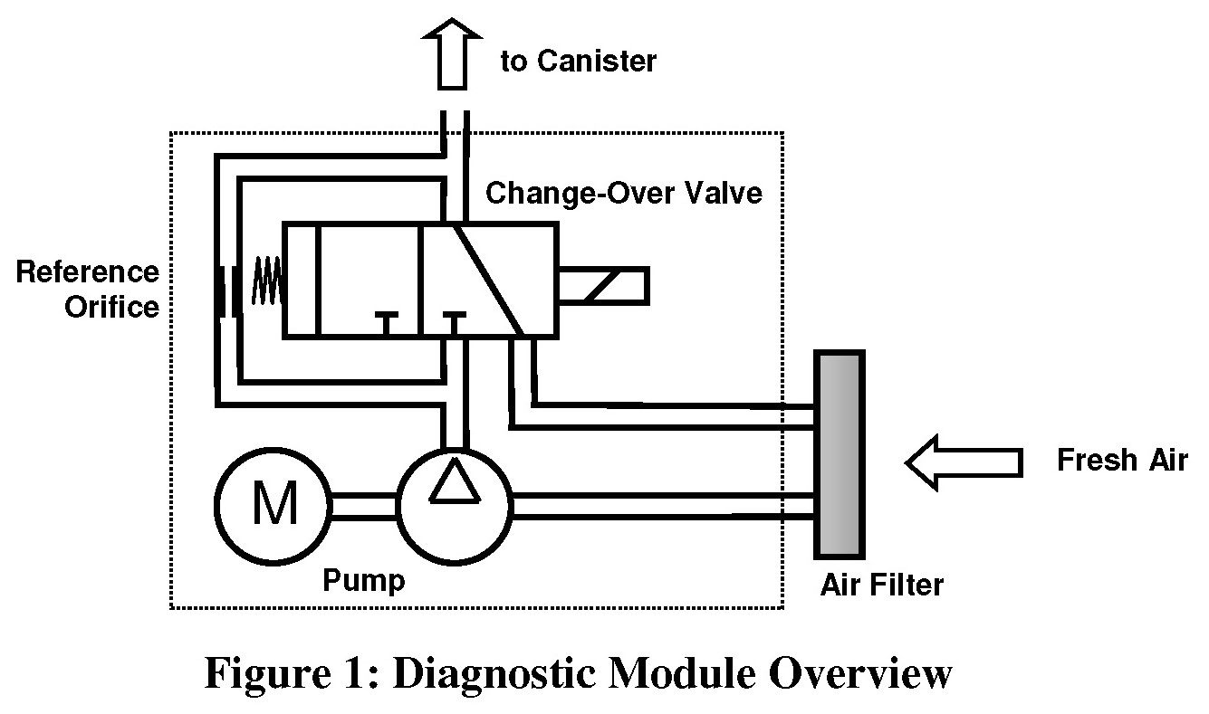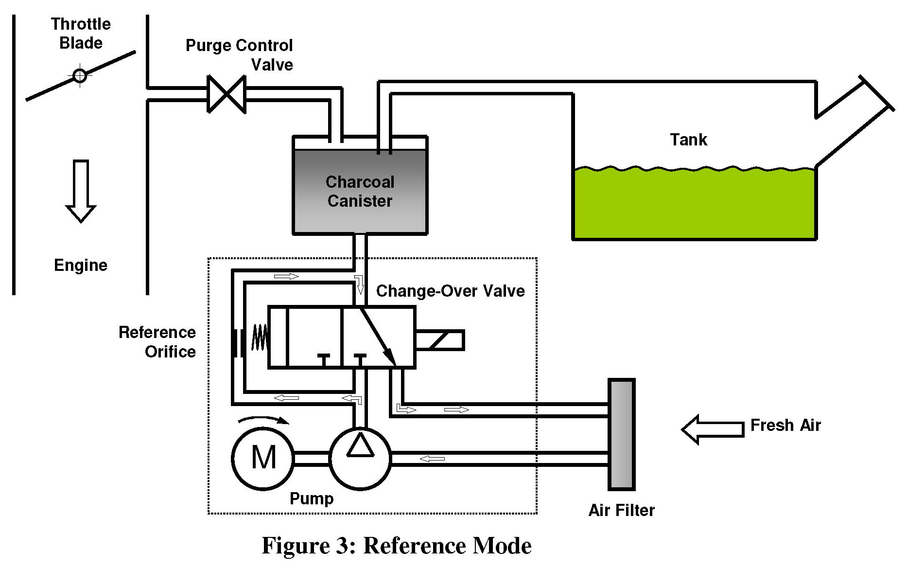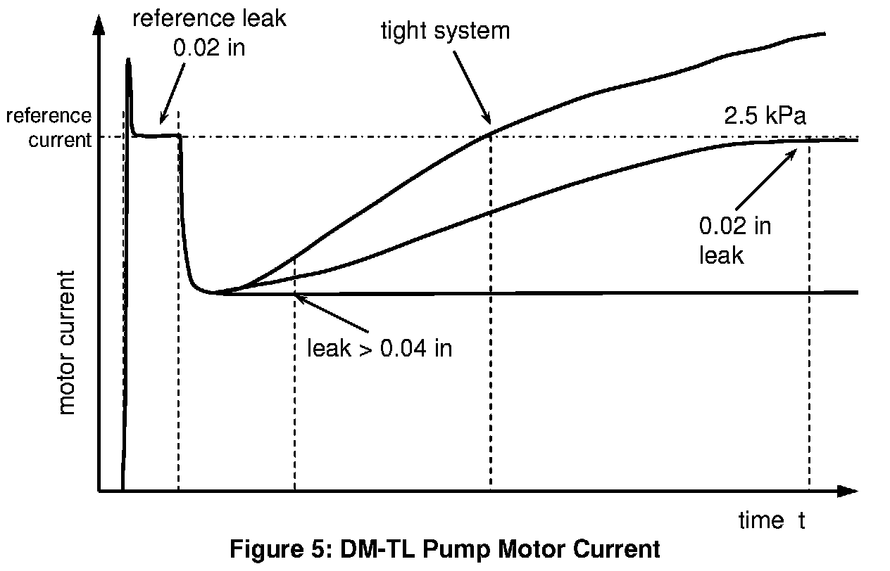 The DM-TL (Diagnostic Module Tank Leakage) is used for monitoring the evaporative system for small (more than 0.02 in) and rough (more than 0.04 in) leaks . It consists of an electrically driven air pump, a change-over valve and a 0.02 inch orifice for reference measurement - see Fig. 1. The tightness of the tank system is obtained by comparing the actual air pump's motor current with that measured when the system is operated with a standardized reference orifice.