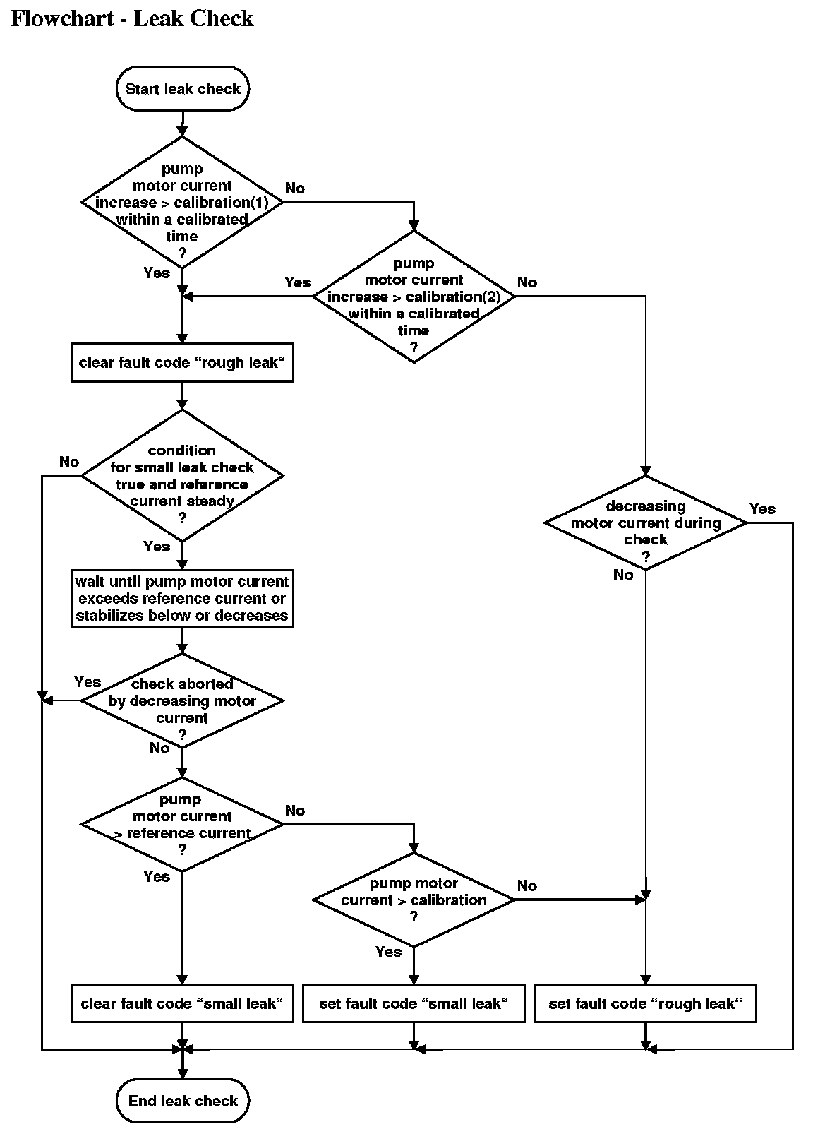 The small leak check is performed if and only if the rough leak check has been performed and no rough leak was detected. If the enable conditions for the small leak check (more than 0.02 in) are fulfilled, the pump's motor remains in the active state (monitoring mode) until its current exceeds the reference current, or the motor current gradient is close to zero (current stabilizes below the reference current). If the motor current exceeds the reference current, the evaporative system is considered as tight. A small leak is assumed only if a second small leak check confirms a current stabilization below the reference current.