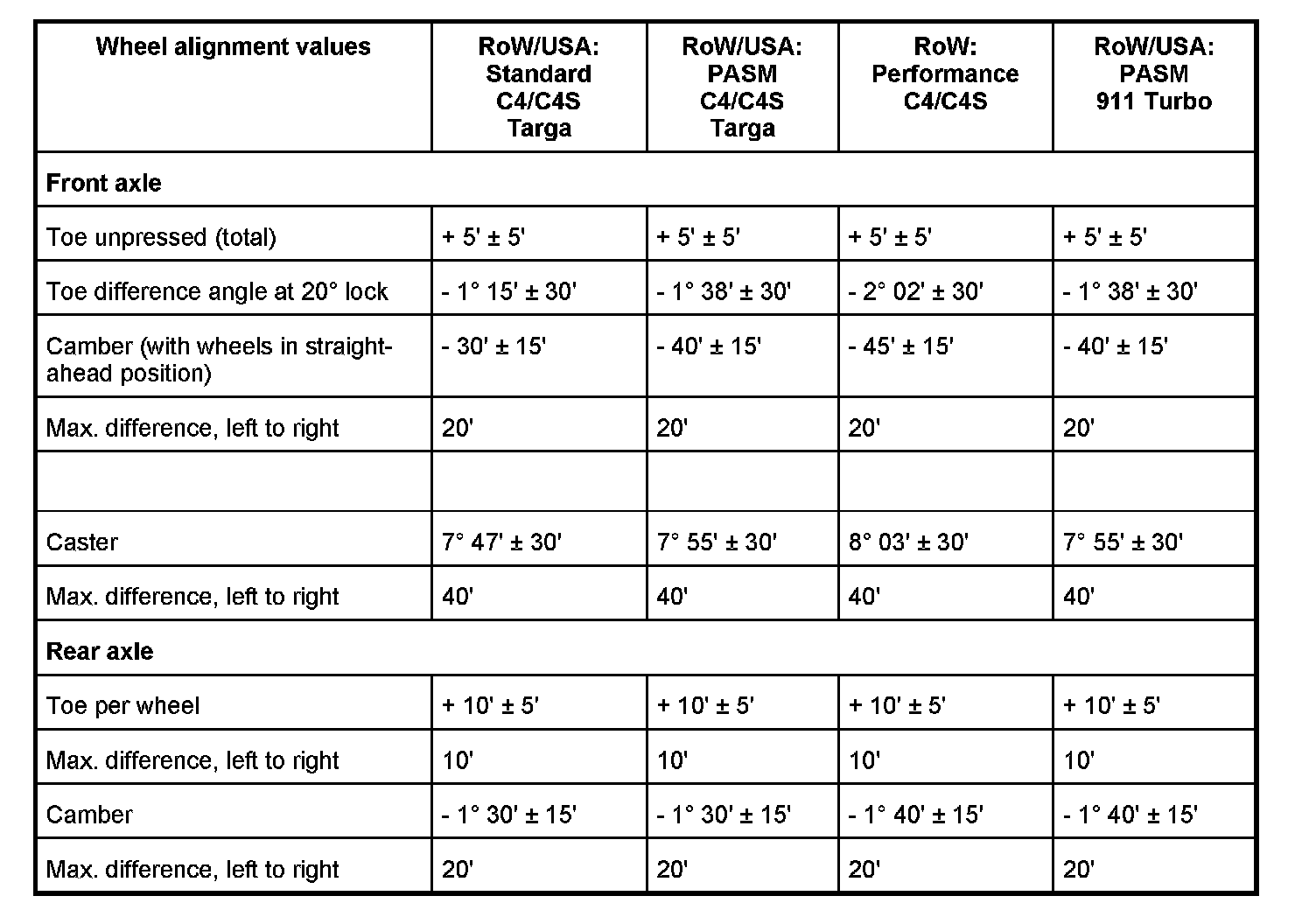 Adjustment values for suspension alignment