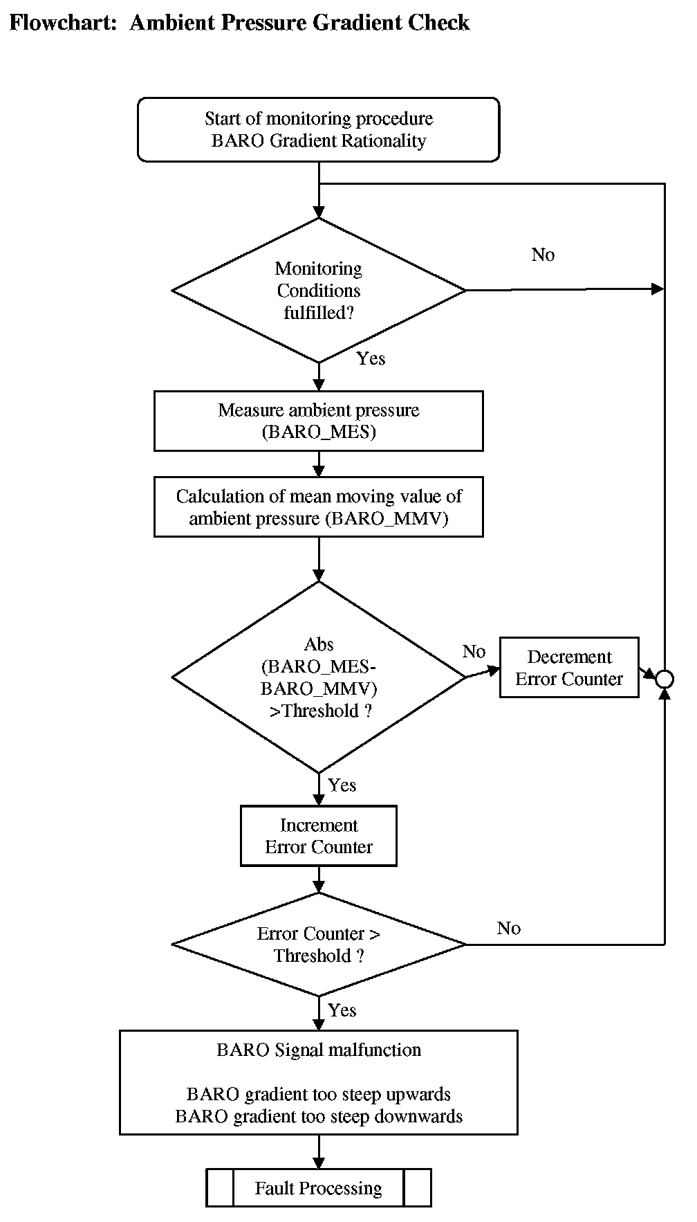 In the ambient pressure gradient check the difference calculated out of the measured ambient pressure and the moving mean value of the ambient pressure is compared to a calibratable threshold. If the delta exceeds the threshold the error is set.