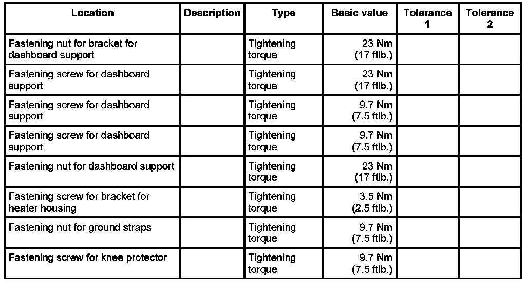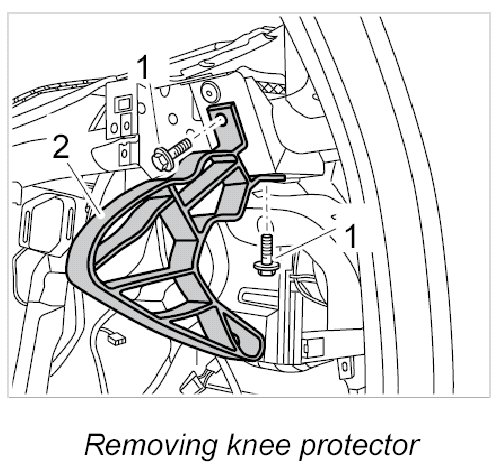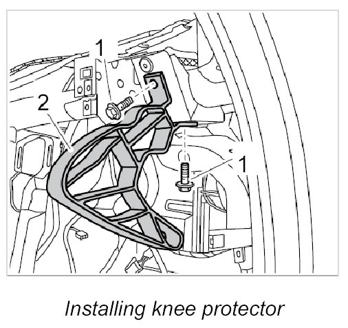 19. Position knee protector -2- on dashboard support and secure in place with fastening screws -1-. Tightening torque: 9.7 Nm (7.5 ftlb.)