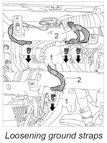3. Undo fastening nuts -1- and place ground straps -2- to one side.