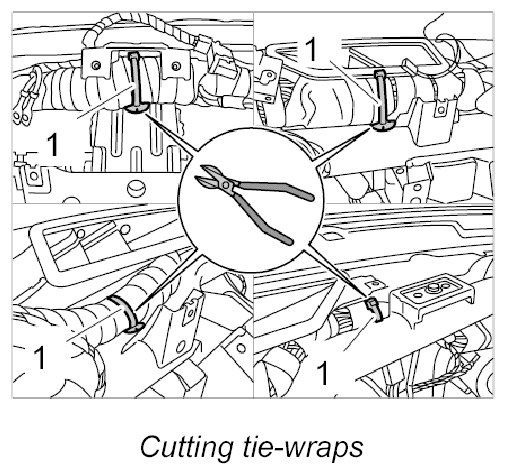 4. Cut tie-wraps -1- on main wire harness.