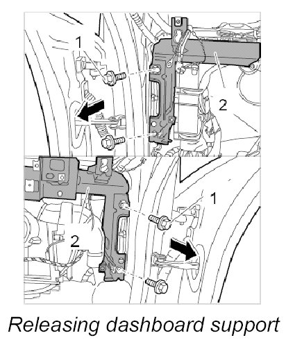 7. Unscrew fastening screws at the left and right -1- on the dashboard support -2-.