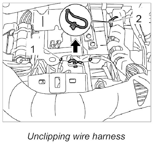 13. Unclip wire harness with fixing clip -1, 2- on dashboard support.