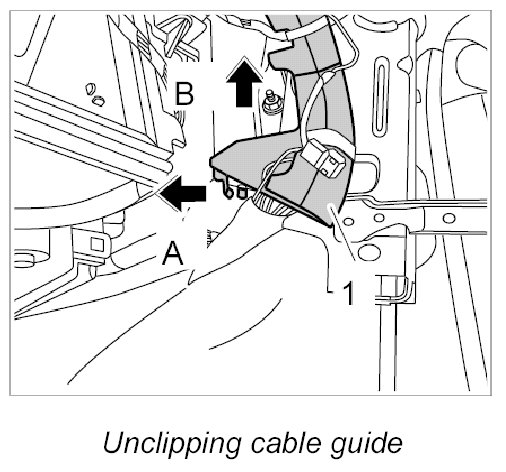 15. Release locking lug -Arrow A- and unclip cable guide -1- on bottom right of dashboard support in an upward direction -Arrow B-.