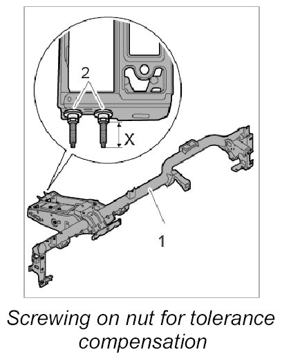 1. Screw on nut for tolerance compensation -2- on dashboard support -1- to the dimension -X= 35 mm-.