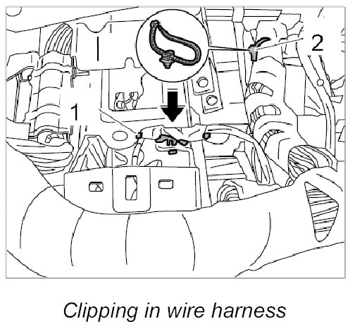 6. Clip wire harness onto dashboard support with a fixing clip -1, 2-.