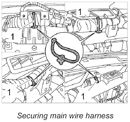 16. Secure main wire harness using new tie-wraps -1-.