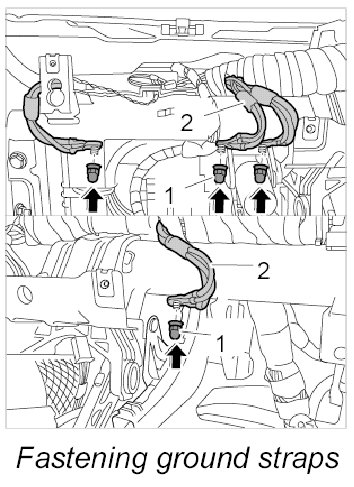 17. Fit ground straps -2- and secure in place with fastening nuts -1-. Tightening torque: 9.7 Nm (7.5 ftlb.)