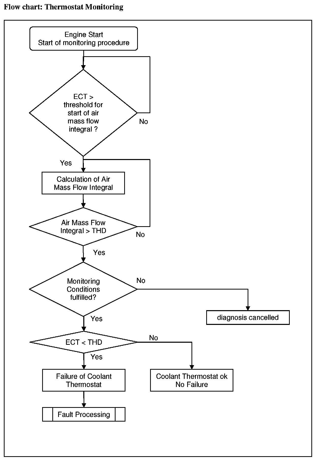 Before a malfunctioning coolant thermostat is entered into failure memory, several monitoring conditions have to be met. Also external failures are checked to inhibit the thermostat diagnosis for this driving cycle if necessary.