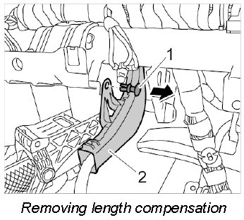 2. Push out fixing clip -1- and unclip length compensation -2-.