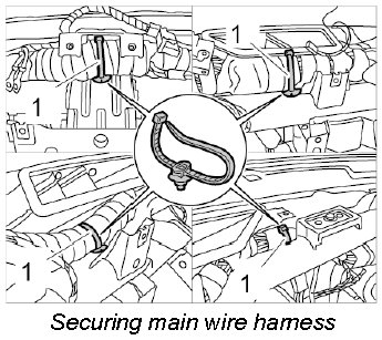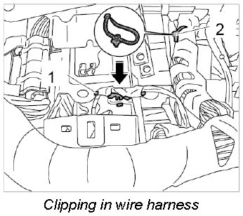 6. Clip wire harness onto dashboard support with a fixing clip -1, 2-.