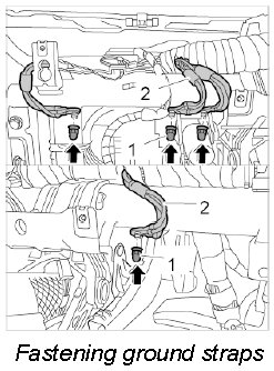 17. Fit ground straps -2- and secure in place with fastening nuts -1-. Tightening torque: 9.7 Nm (7.5 ftlb.)