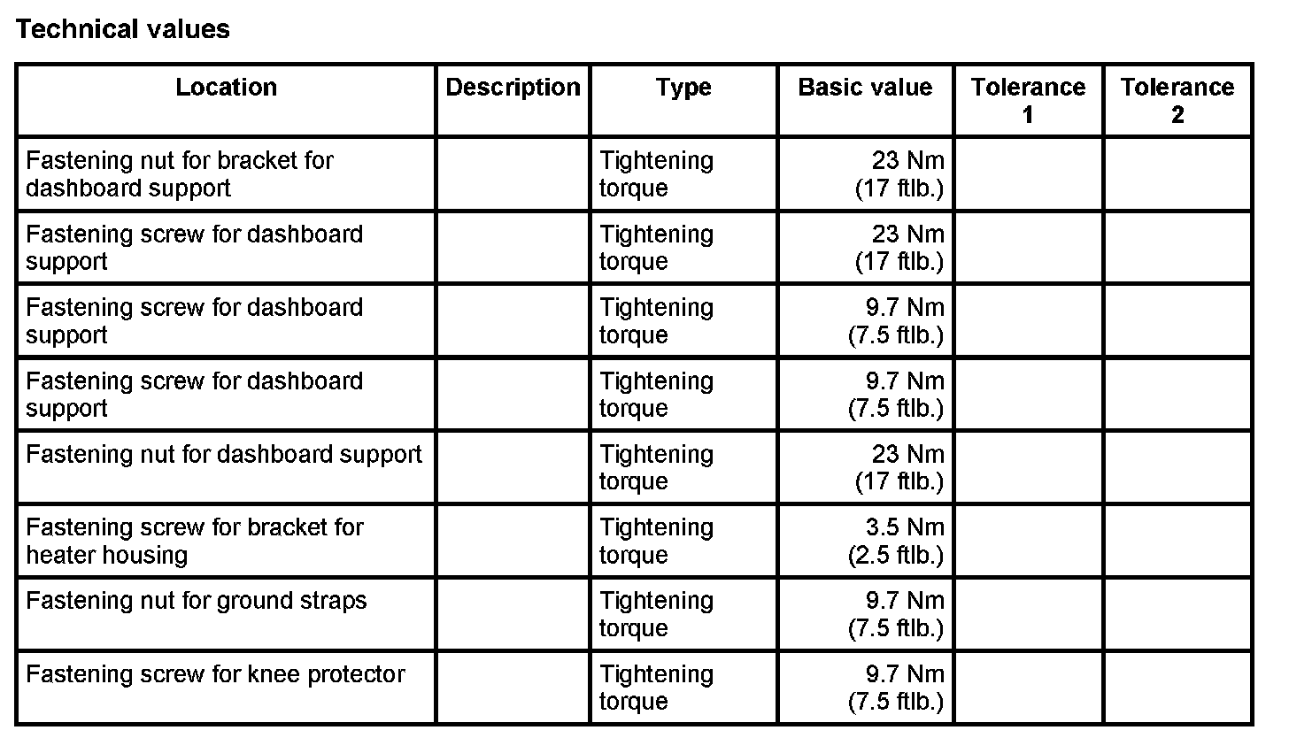 19. Position knee protector -2- on dashboard support and secure in place with fastening screws -1-. Tightening torque: 9.7 Nm (7.5 ftlb.)
