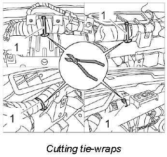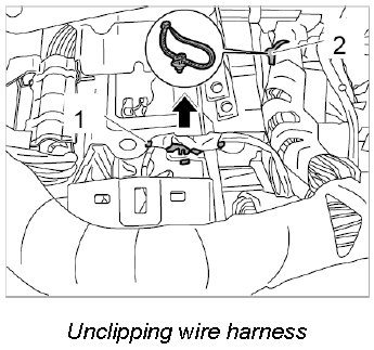 13. Unclip wire harness with fixing clip -1, 2- on dashboard support.