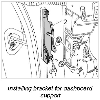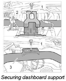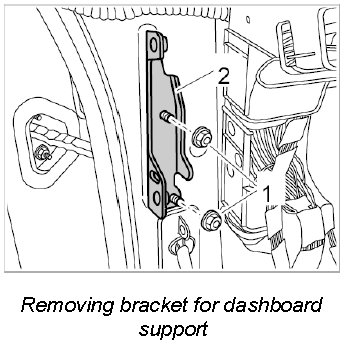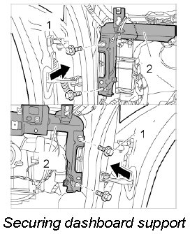7. Unscrew fastening screws at the left and right -1- on the dashboard support -2-.