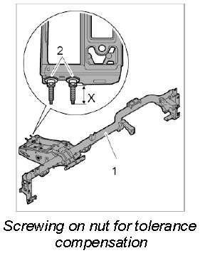 1. Screw on nut for tolerance compensation -2- on dashboard support -1- to the dimension -X= 35 mm-.