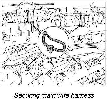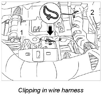 6. Clip wire harness onto dashboard support with a fixing clip -1, 2-.
