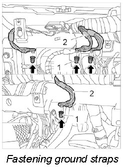 17. Fit ground straps -2- and secure in place with fastening nuts -1-. Tightening torque: 9.7 Nm (7.5 ftlb.)