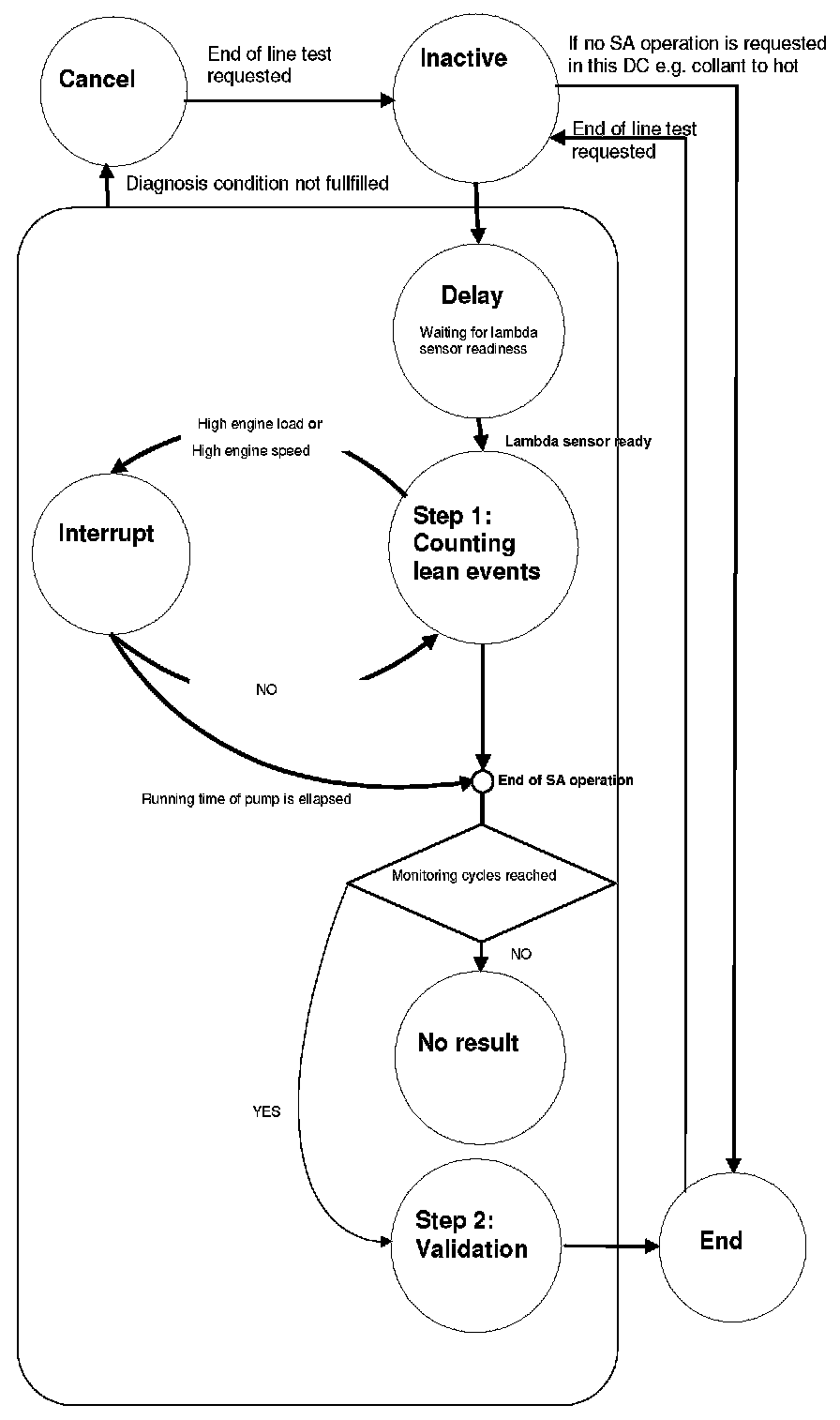 After completion of the secondary air function, the result of step 1 must be validated. If the number of monitoring cycles is reached the lambda controller is used to check if the mixture is in a "normal" (non lean) lambda-range thereby ensuring no lean-problem is present.