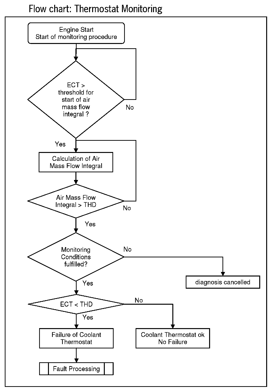Before a malfunctioning coolant thermostat is entered into failure memory, several monitoring conditions have to be met. Also external failures are checked to inhibit the thermostat diagnosis for this driving cycle if necessary.