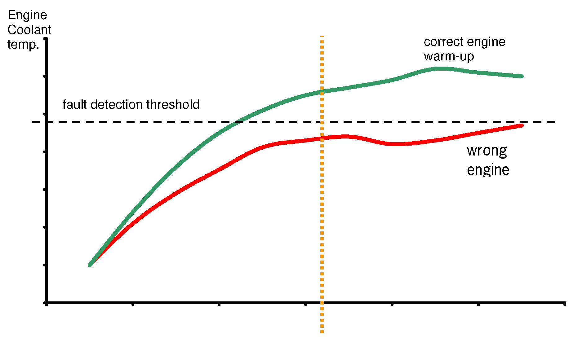 If under normal driving conditions the ECT signal is below this threshold a malfunctioning coolant thermostat is detected.