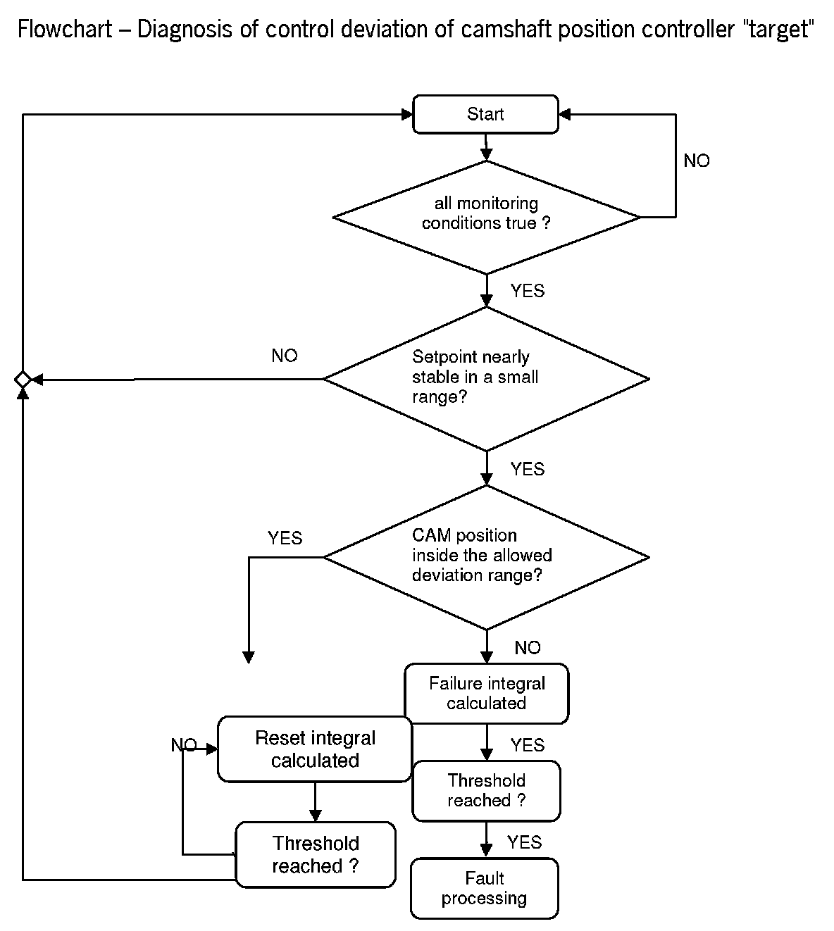 The target position has to be in a limited stable range. If the actual position is near the target position the diagnosis is ok, otherwise not. This will be checked by calculating two integrals (Reset integral and Failure integral). Both integral values have the same threshold to reach. If the failure integral reaches this threshold the fault processing begins and a fault code (DTC) is stored.