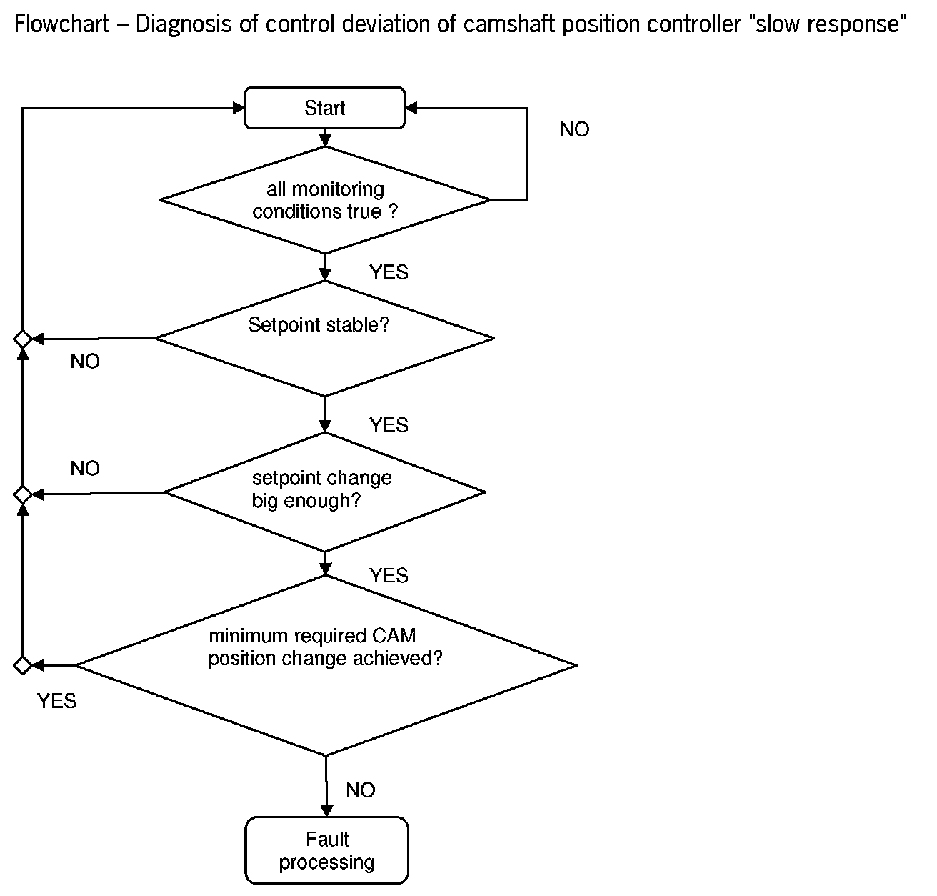 The set point and the camshaft position are saved at the beginning of a set point change. If this set point change is big enough (gradient), the camshaft phasing change is evaluated. If the change is smaller than a threshold, a slow response is detected, and if the value is greater, then there is no malfunction. By detecting a malfunction, the fault processing begins and a DTC is stored.