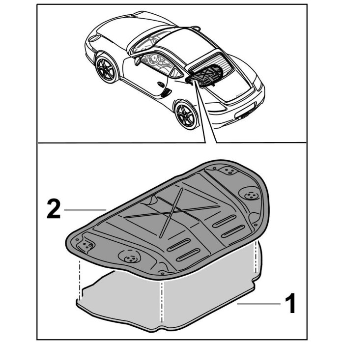 1. Pull off protective film and stick insulation for engine compartment lid -1- on the inside in the marked area of the engine compartment lid -2-.