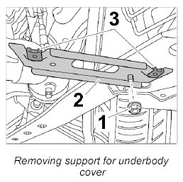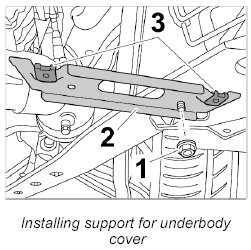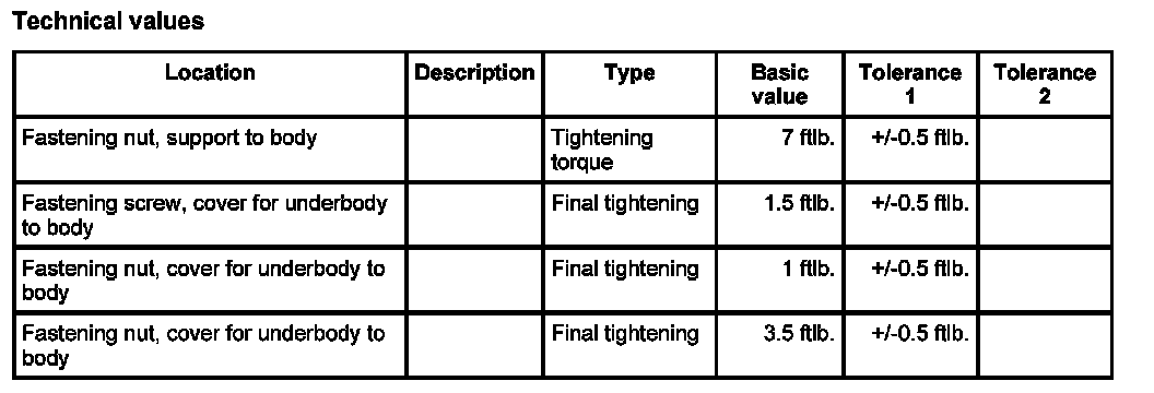 1. Position support -2- for underbody cover and tighten with the fastening nut -1-. Tightening torque, Tightening torque: 7 ftlb.±0.5 ftlb.