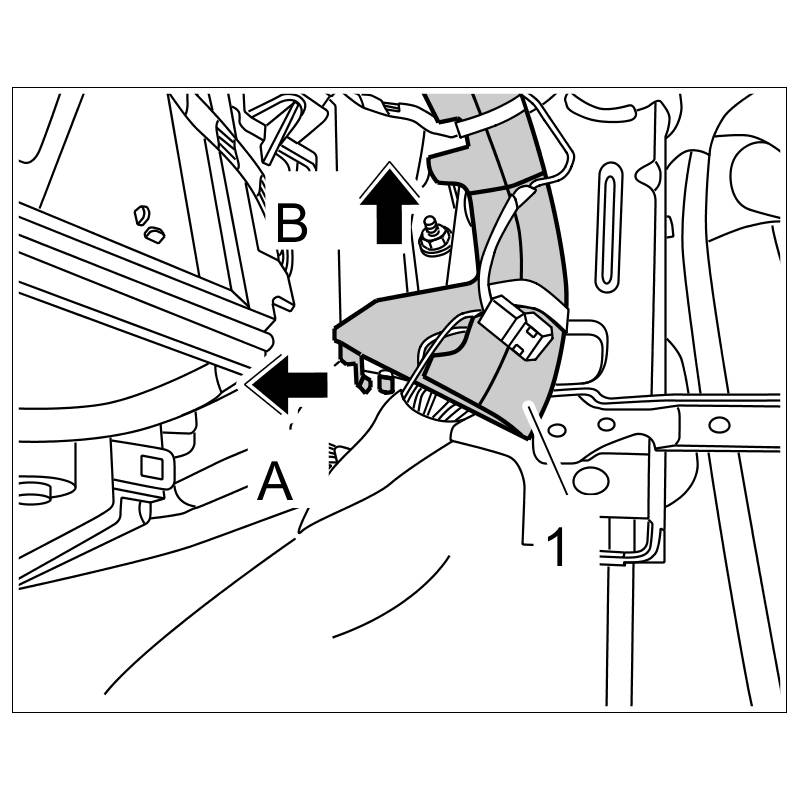 15. Release locking lug -Arrow A- and unclip cable guide -1- on bottom right of dashboard support in an upward direction -Arrow B-.
