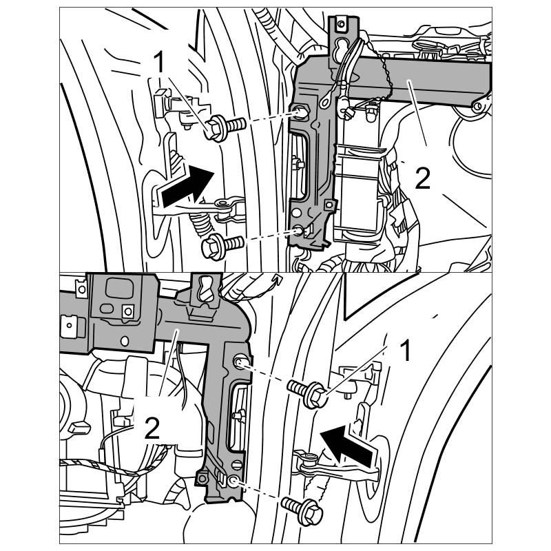 8. Unscrew left fastening screw -1- and remove bracket -2-.