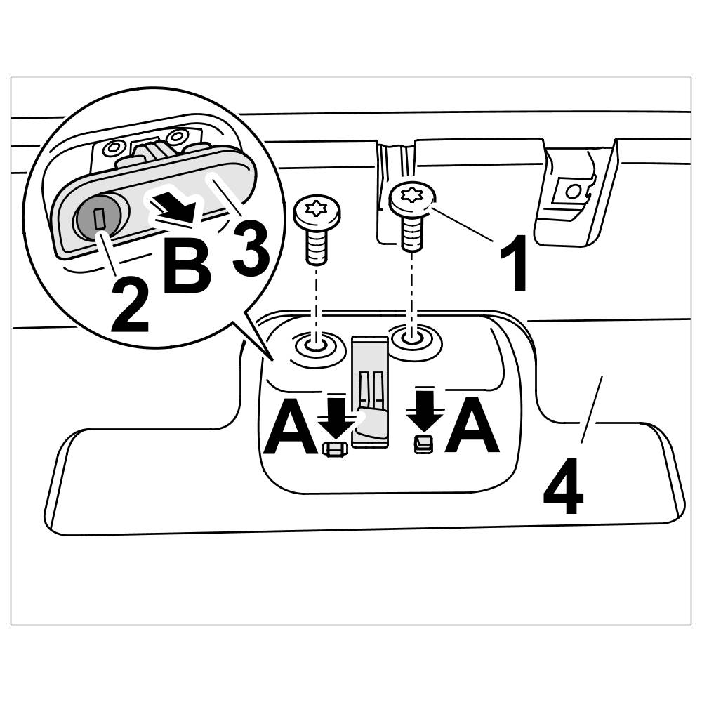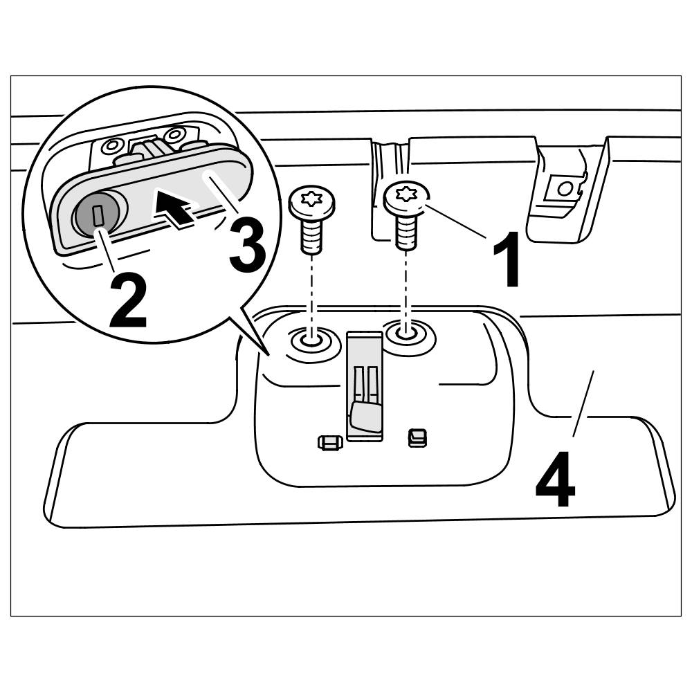 1. Position the handle -3- with the glove compartment lock -2- in the support for the glove compartment lid -4- ( -arrow- ) and secure in position with the fastening screws -1-.