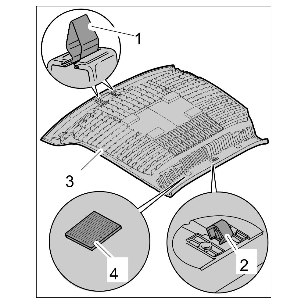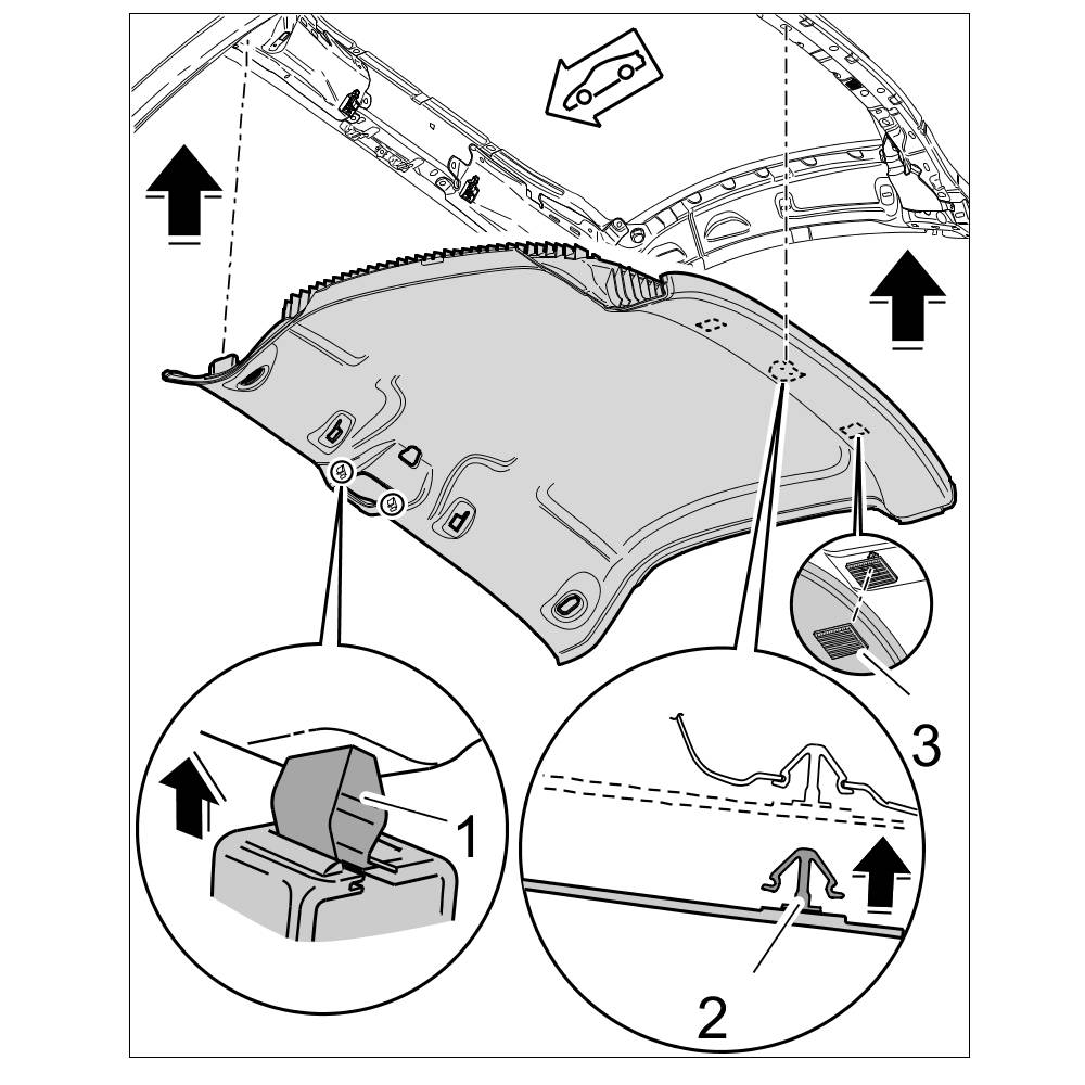 8. Check clamps -1- and fixing clip -2- of headliner -3- for deformation, replace if necessary.