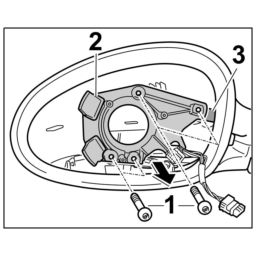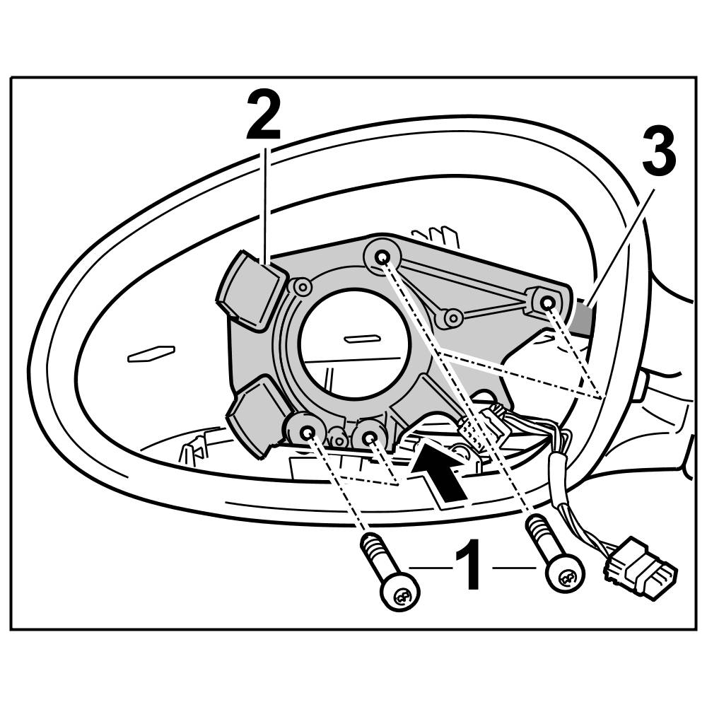 3. Position plate -2- on mirror base -3- ( -arrow- ) and secure using the fastening screws -1-.