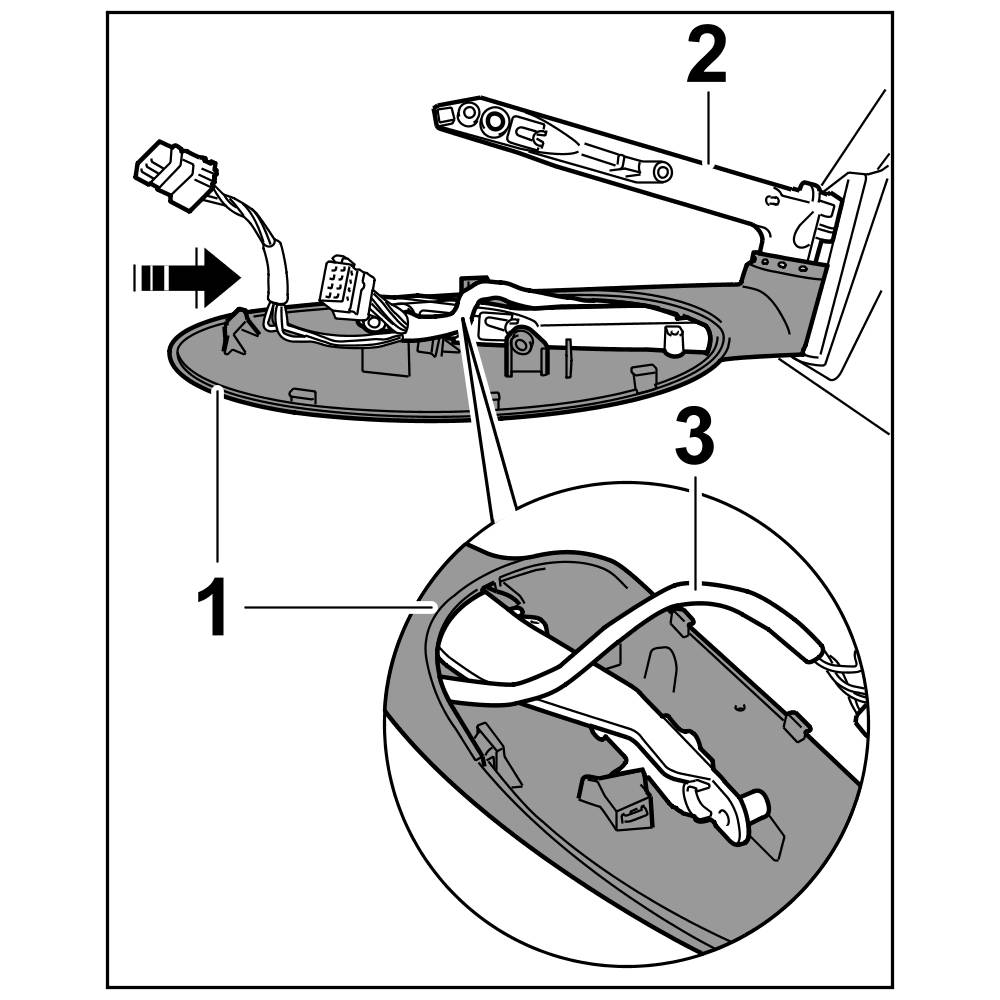 1. Insert wire harness -3- through cover -1- and slide cover into mirror base -2- ( -arrow- ).
