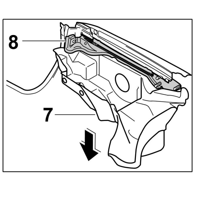 6. Disconnect water drip pan at the left and right -7- from the guide rail -8- ( -arrow- ).