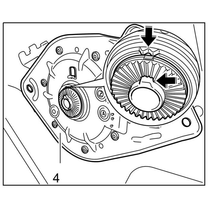 1. Unscrew the fastening screw -1- on the lever -2-. Remove friction washer -3- and lever -2- from the convertible top gears -4-.