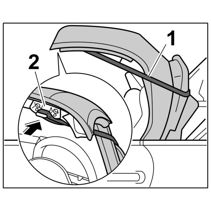 1. Disengage retaining strap -1- at the front at the centring journal -2- and fasten Velcro fastener of retaining strap to the tension bow.