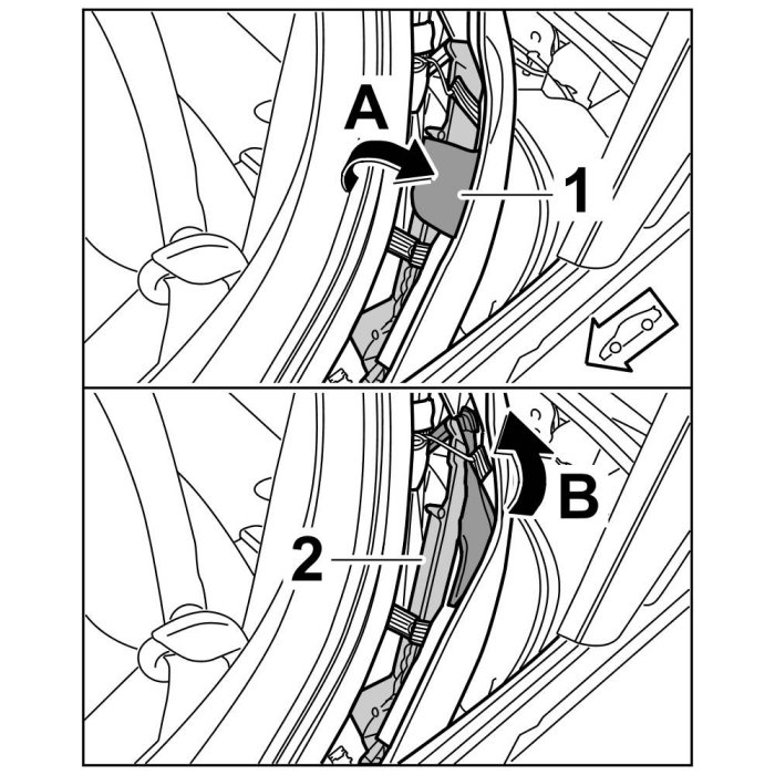2.1. Pull out tightening strip -item 1- slightly -arrow A- and attach at the top to the lug on the main folding top bow -item 2- ( -arrow B- ).