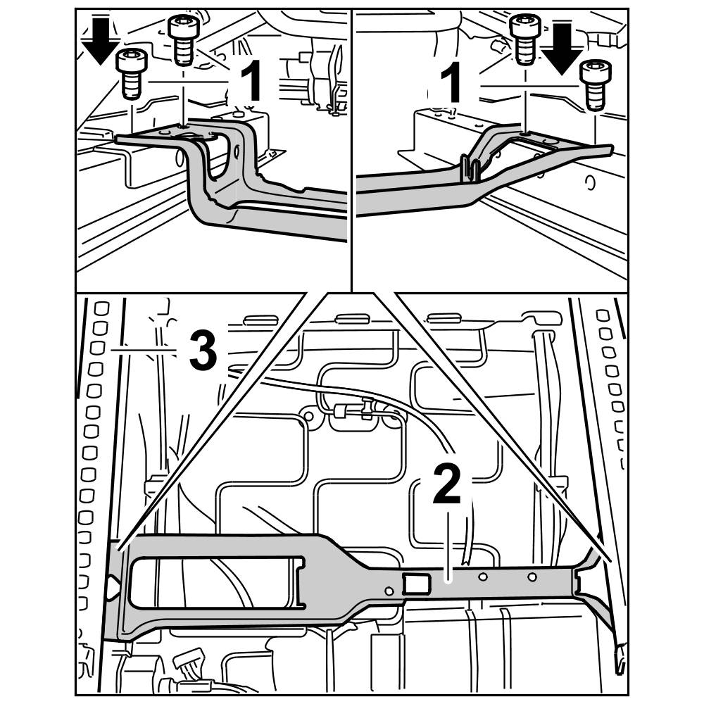 1. Position retainer plate -2- on the seat frame -3- and secure with the fastening screws -1- ( -arrows- ). => Tightening torque: 24 Nm (18 ftlb.)+/-4 Nm (+/-3 ftlb.)