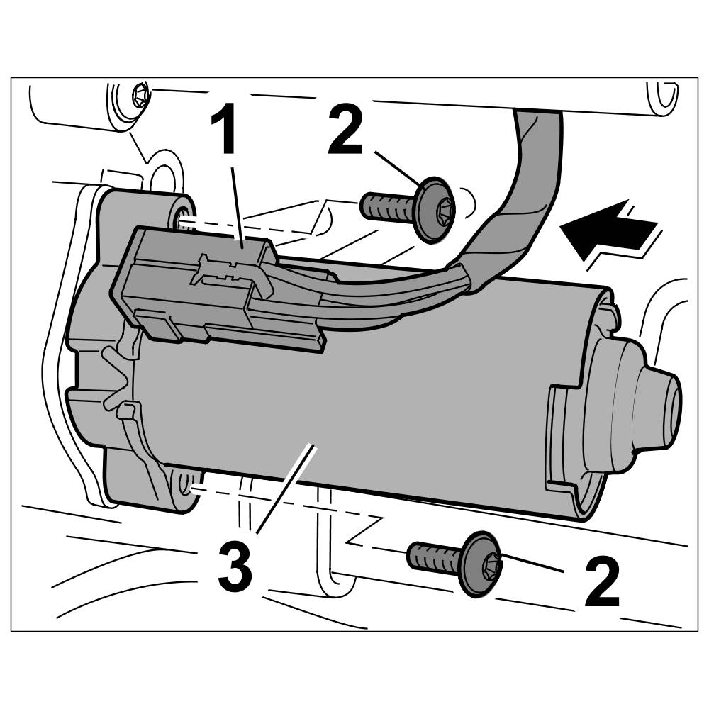 3. Attach connector -1- to motor for front vertical adjustment -3- until it engages firmly.